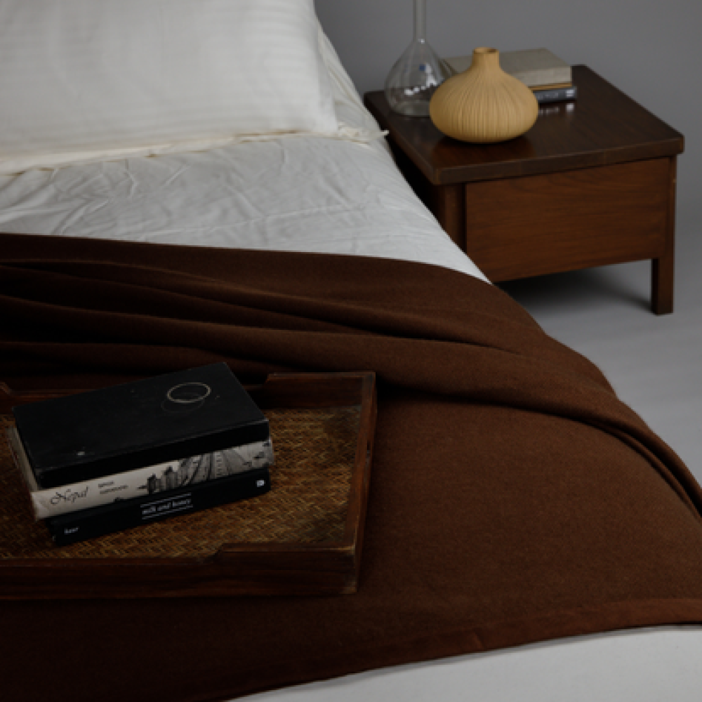 Relax in this sumptuously soft cocoa California queen blanket. Handwoven from 100% premium Himalayan cashmere by skilled artisans, this is a bespoke piece that adds an earthy sophistication to any room. Measuring a generous 90 x 104 inches, it is woven using an elegant weft back technique and finished with spun silk trim, resulting in a plush, hypoallergenic texture that is effortlessly gentle against the skin.