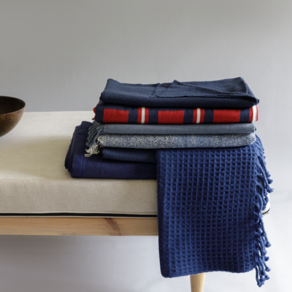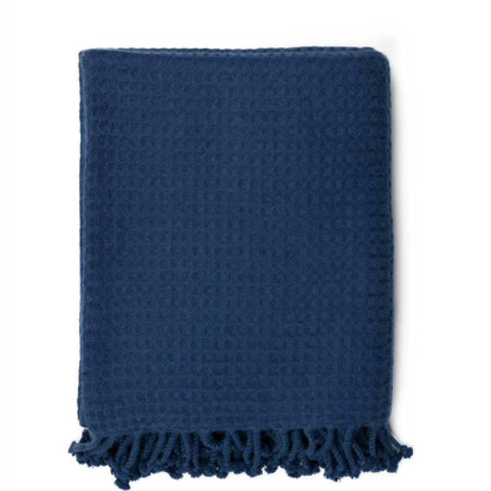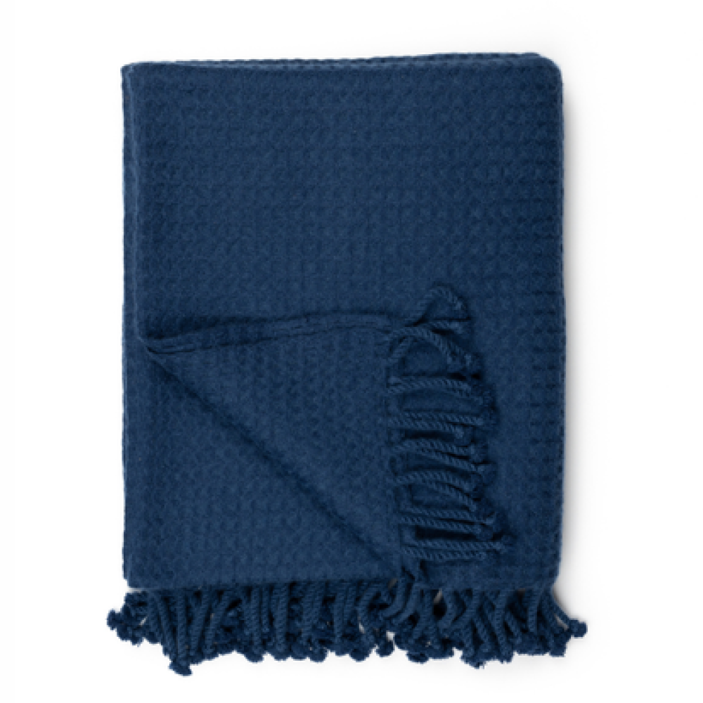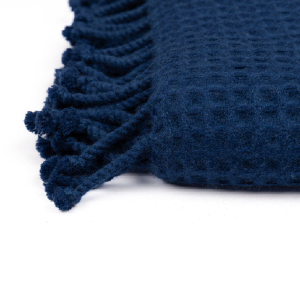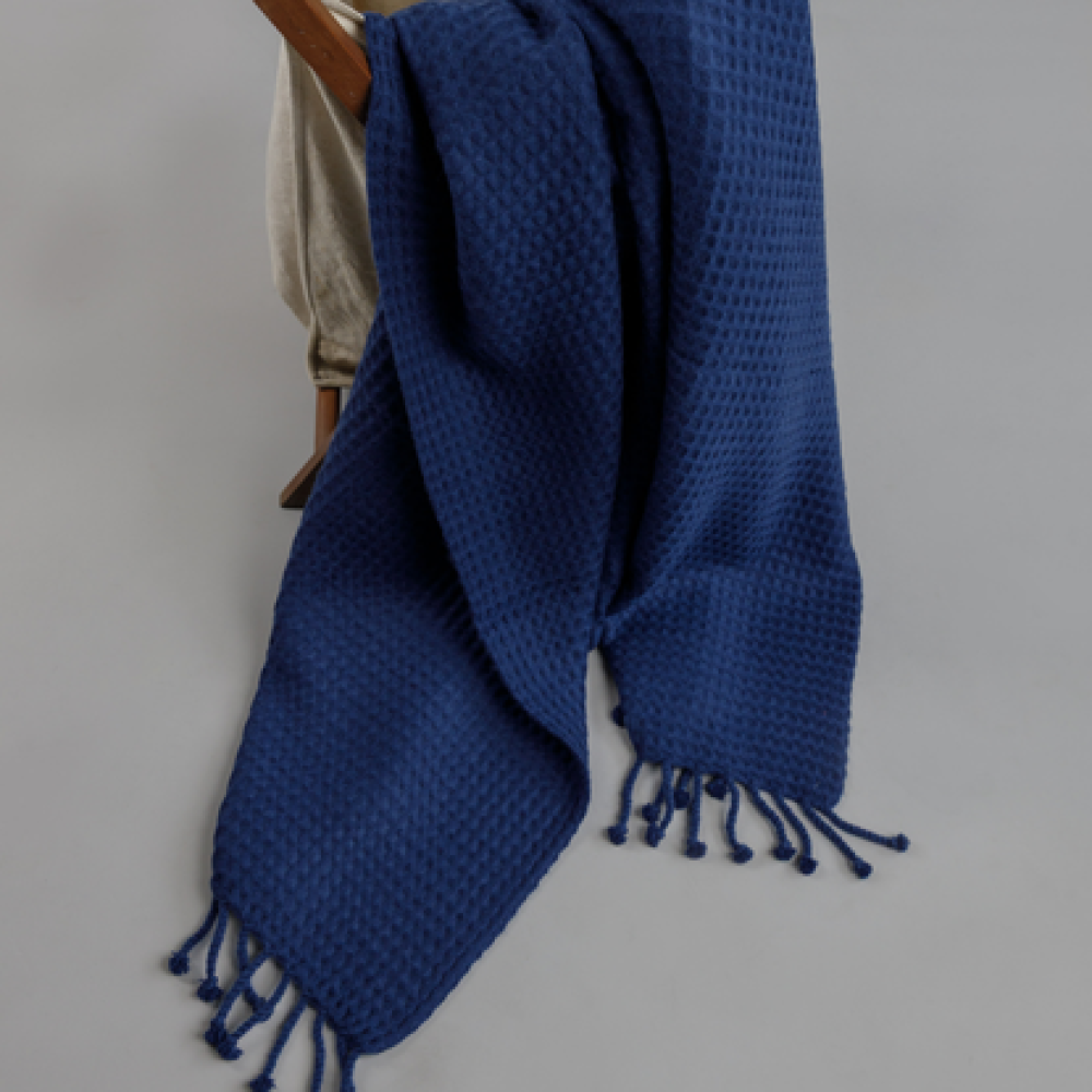 Layer up with this deep cobalt large throw, made from 100% premium cashmere and handwoven by Himalayan artisans. Its unique waffle weave crafts an elegant, grid-like texture, adding rich depth and sophistication to any room. Measuring a generous 60 x 72 inches, this lightweight and hypoallergenic throw is finished with delicate tassel trim, making it a versatile piece for most interiors.