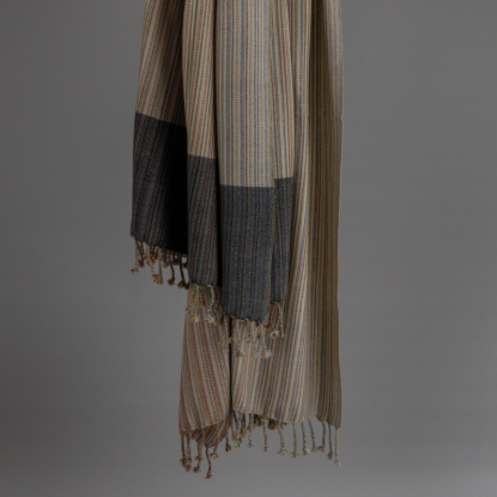 The shawl's soft multi-color palette evokes a harmonious blend of calm and vitality, making it a piece that complements a diverse range of styles and moods. Its careful striped pattern and hues make it a cherished heirloom to own.