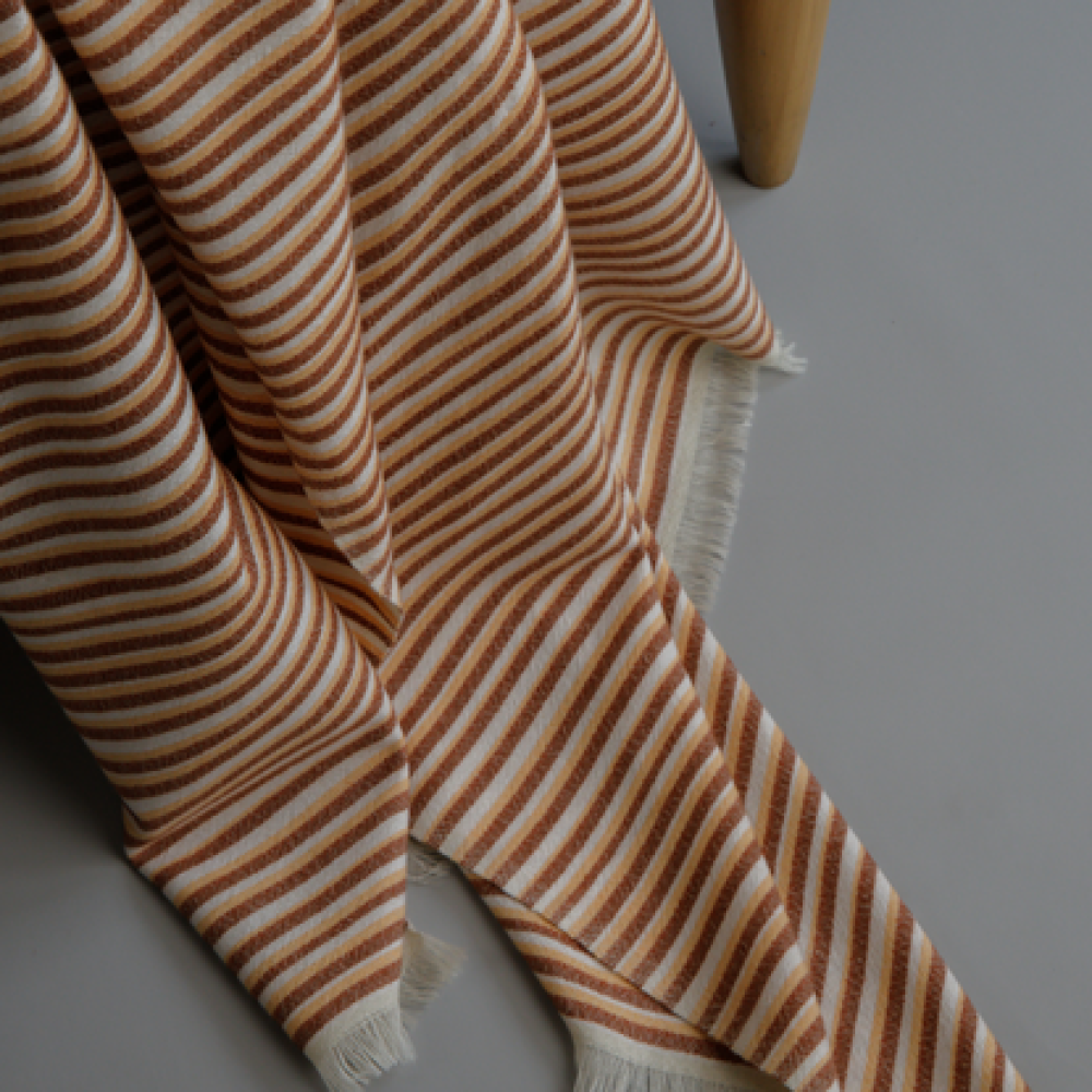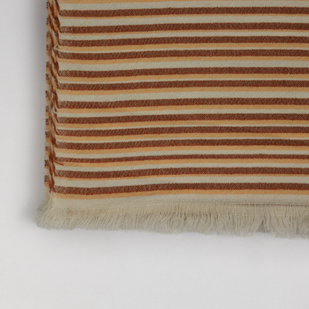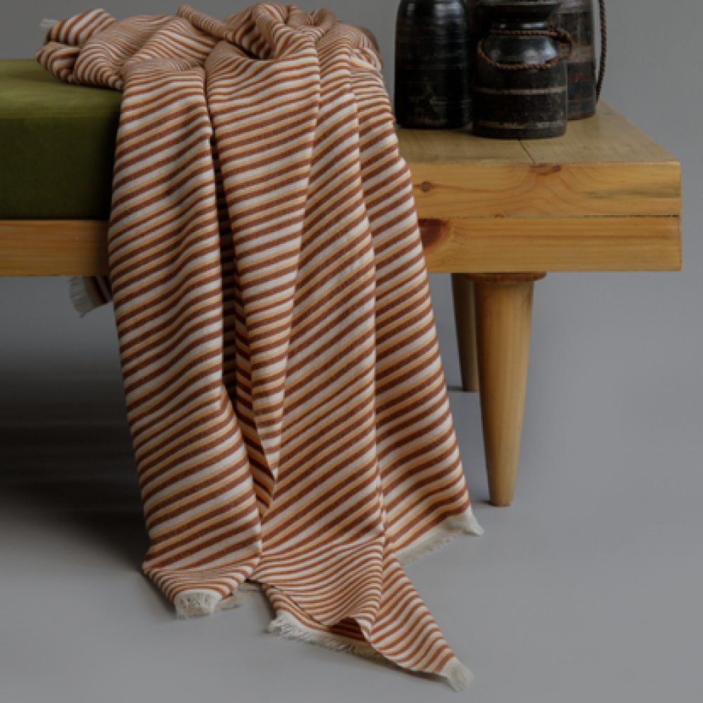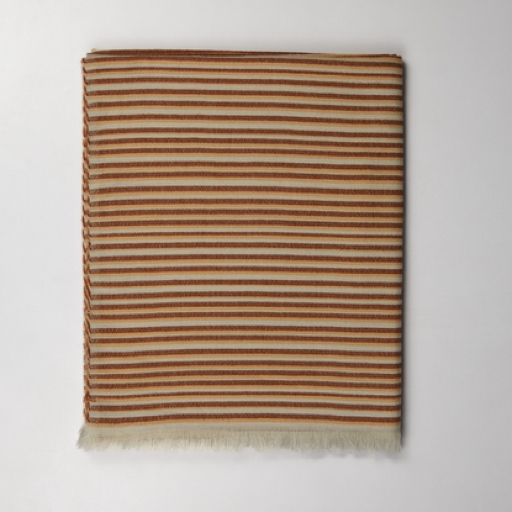 Enrich your space with this elegant, subtle, striped large throw full of natural orange hues. Intricately handwoven from premium 100% cashmere by master Himalayan artisans, this piece embodies luxury. Measuring 60 x 72 inches, woven using a 2 pedal technique, the artisan craftsmanship is preserved and maintained after multiple uses of this superior, soft, and elegant drape.
