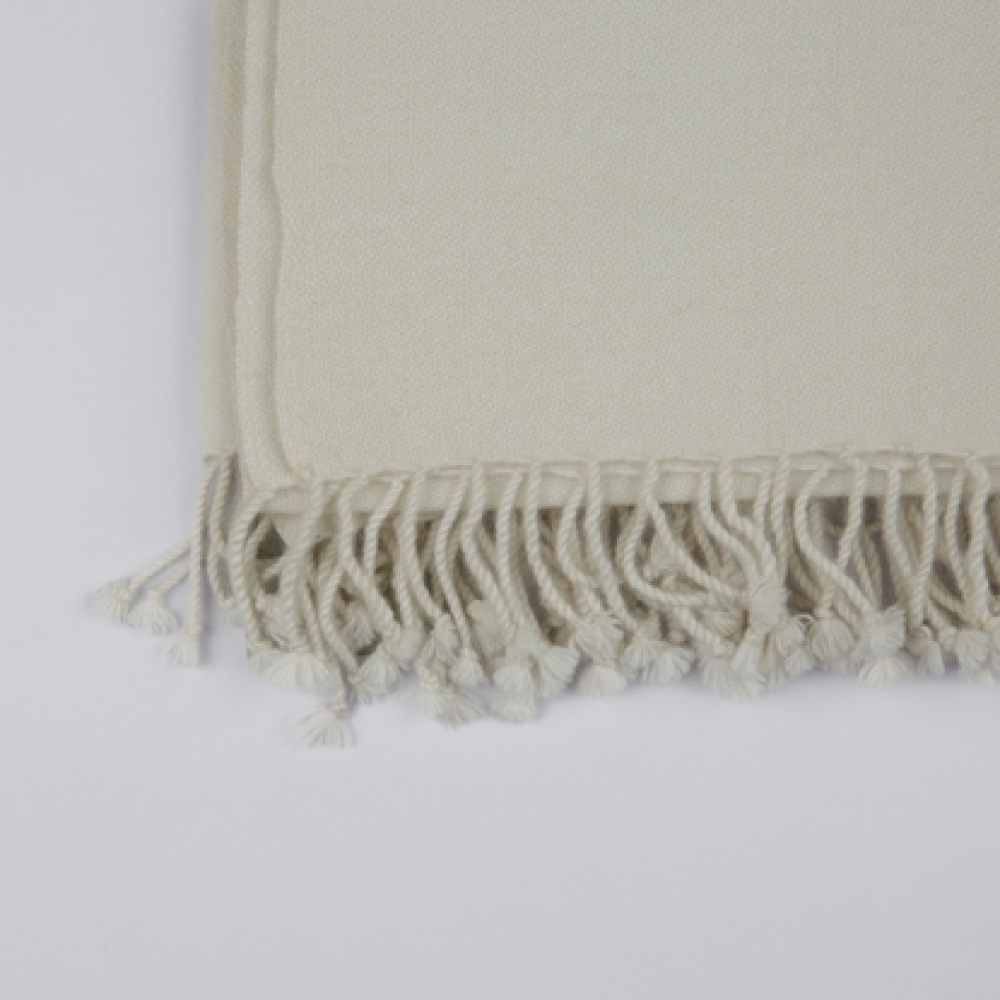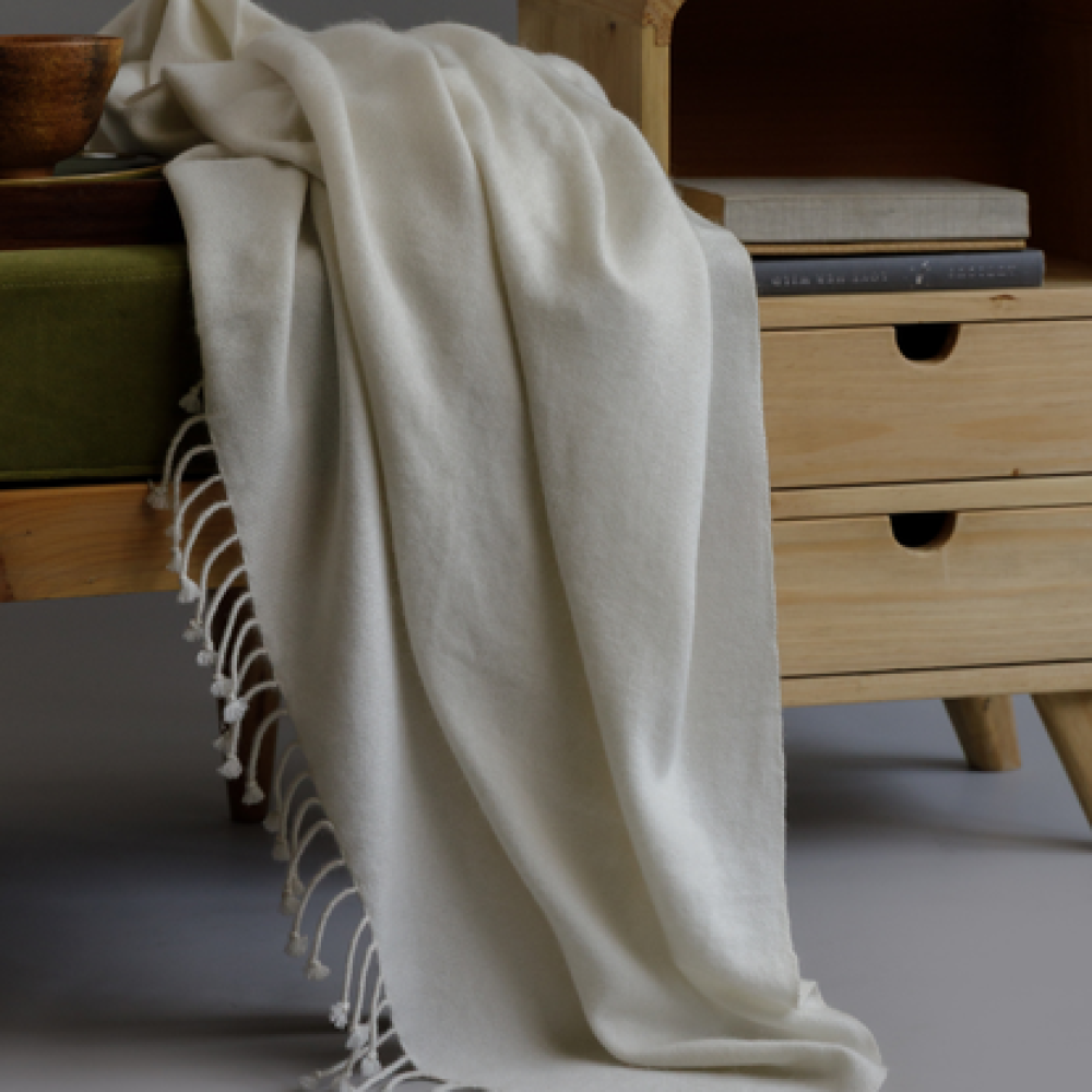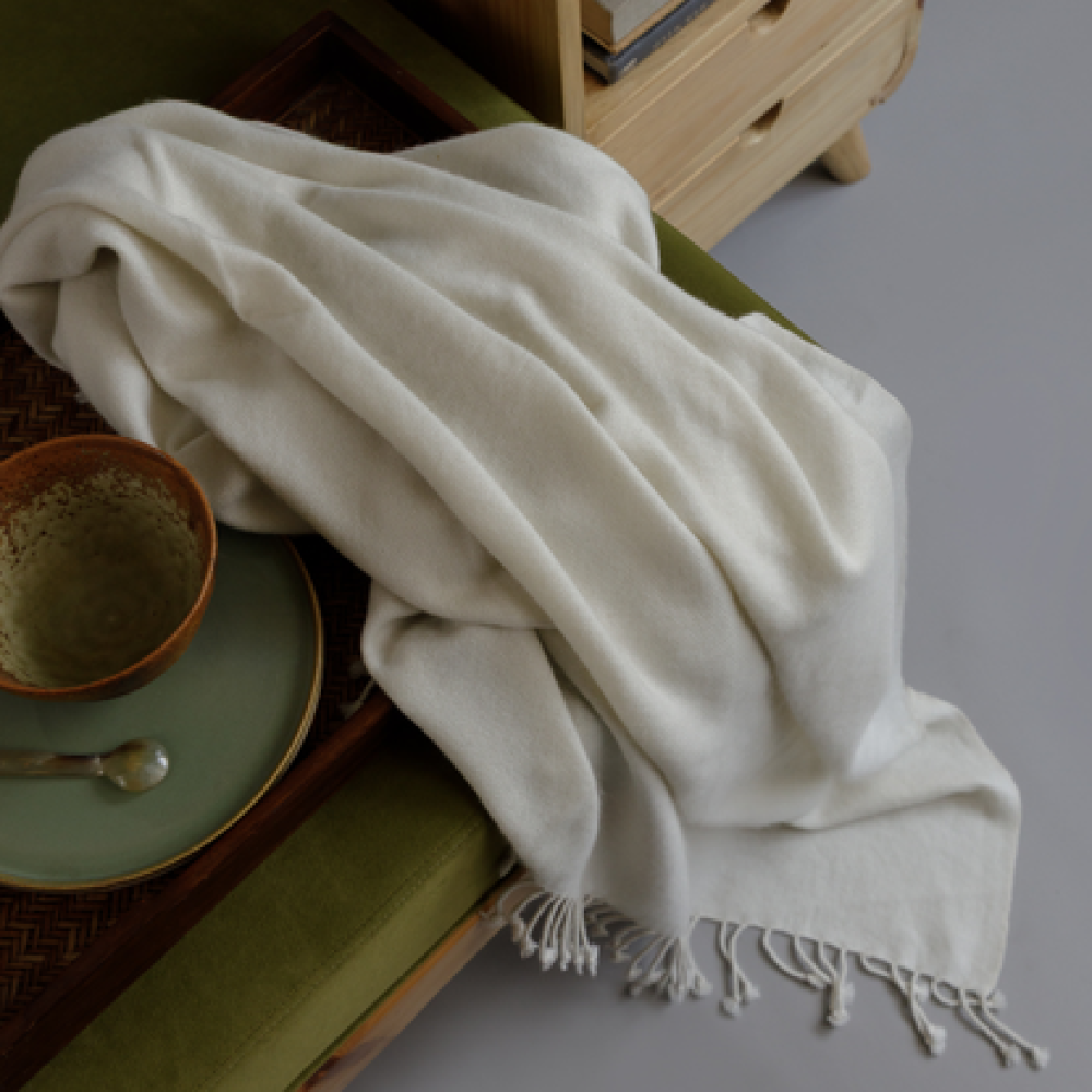 Elevate the sophistication of a space with this refined egret throw. Handcrafted by skilled Himalayan artisans from 100% premium cashmere, this plush piece is hypoallergenic and offers sumptuous softness against the skin. Measuring 50 by 60 inches, it is woven using a sophisticated weft-back technique and finished with timeless twisted tassels, embodying an effortless class and calming touch.