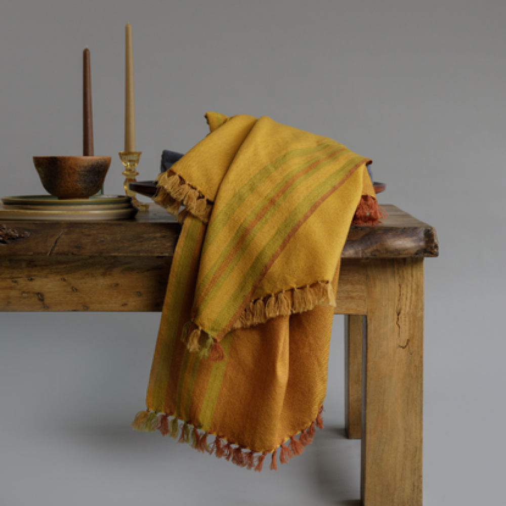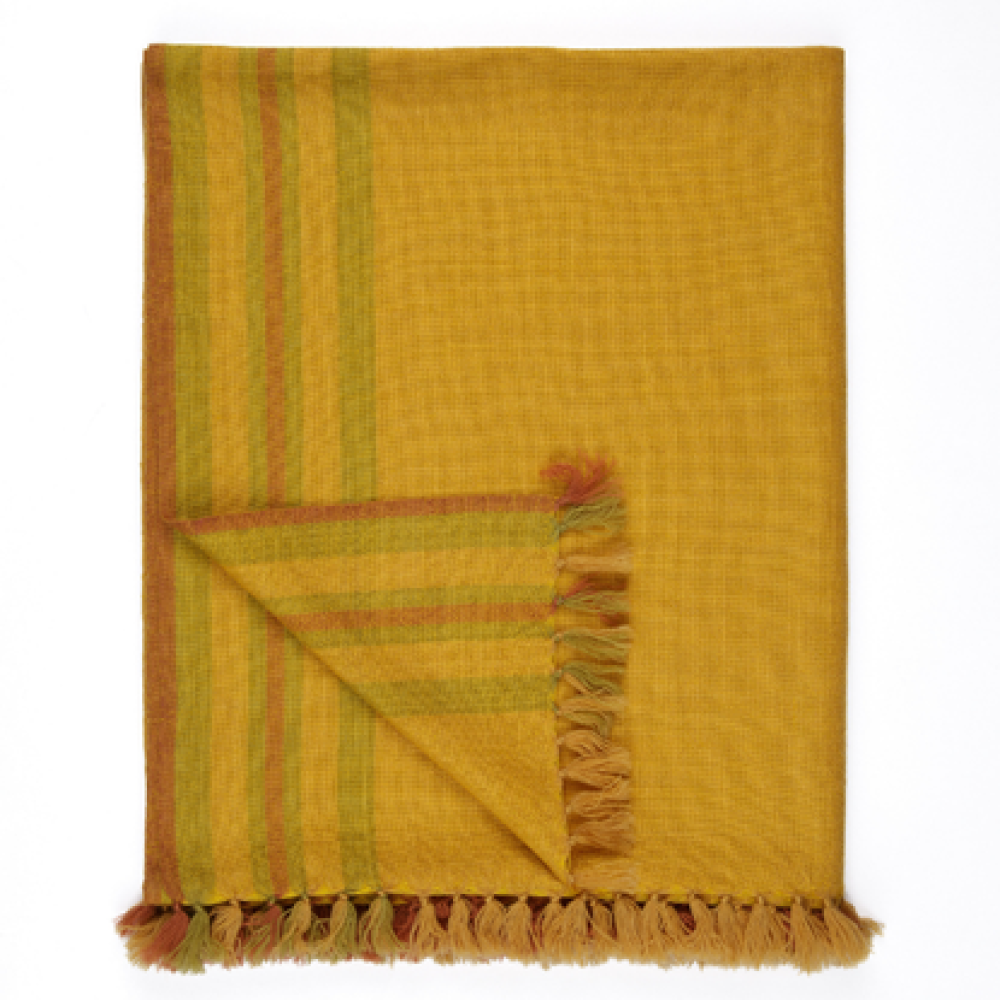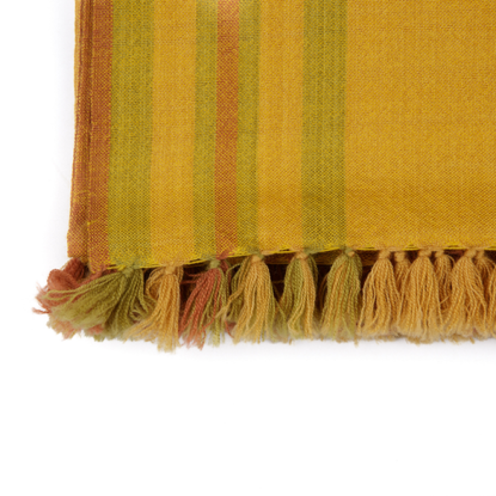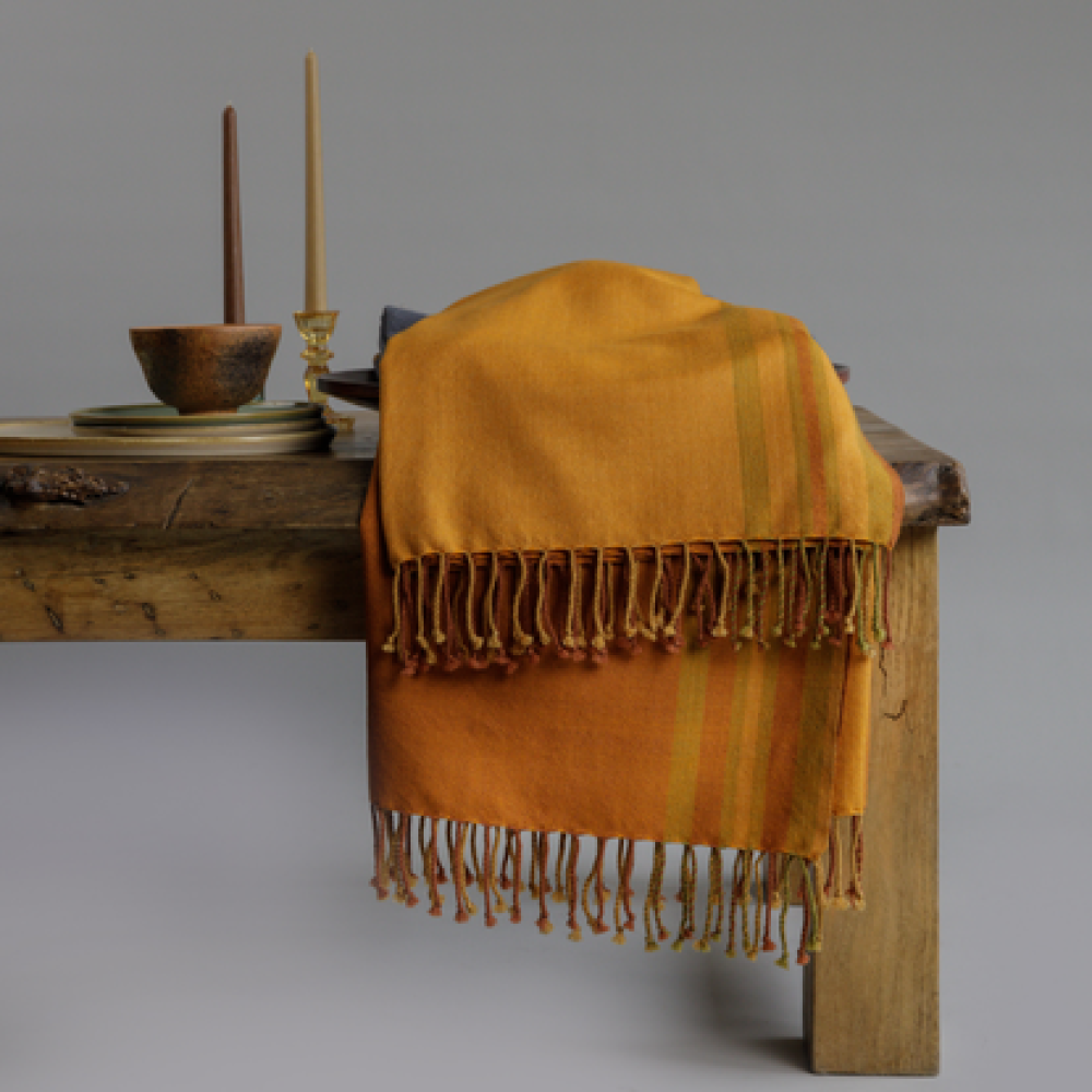 Infuse your space with vibrant warmth large orange rust multi-color throw. Handwoven by skilled Himalayan artisans from 100% wool renowned for its natural temperature-regulating properties, this throw offers cozy comfort and enduring quality. Measuring 60 by 72 inches and crafted using a delicate gauze weave, it is elegantly finished with a refined tassel trim, making it a stylish, sustainable addition to any home.