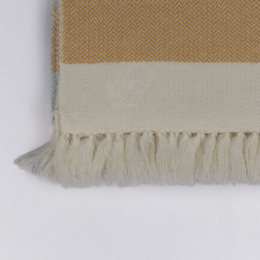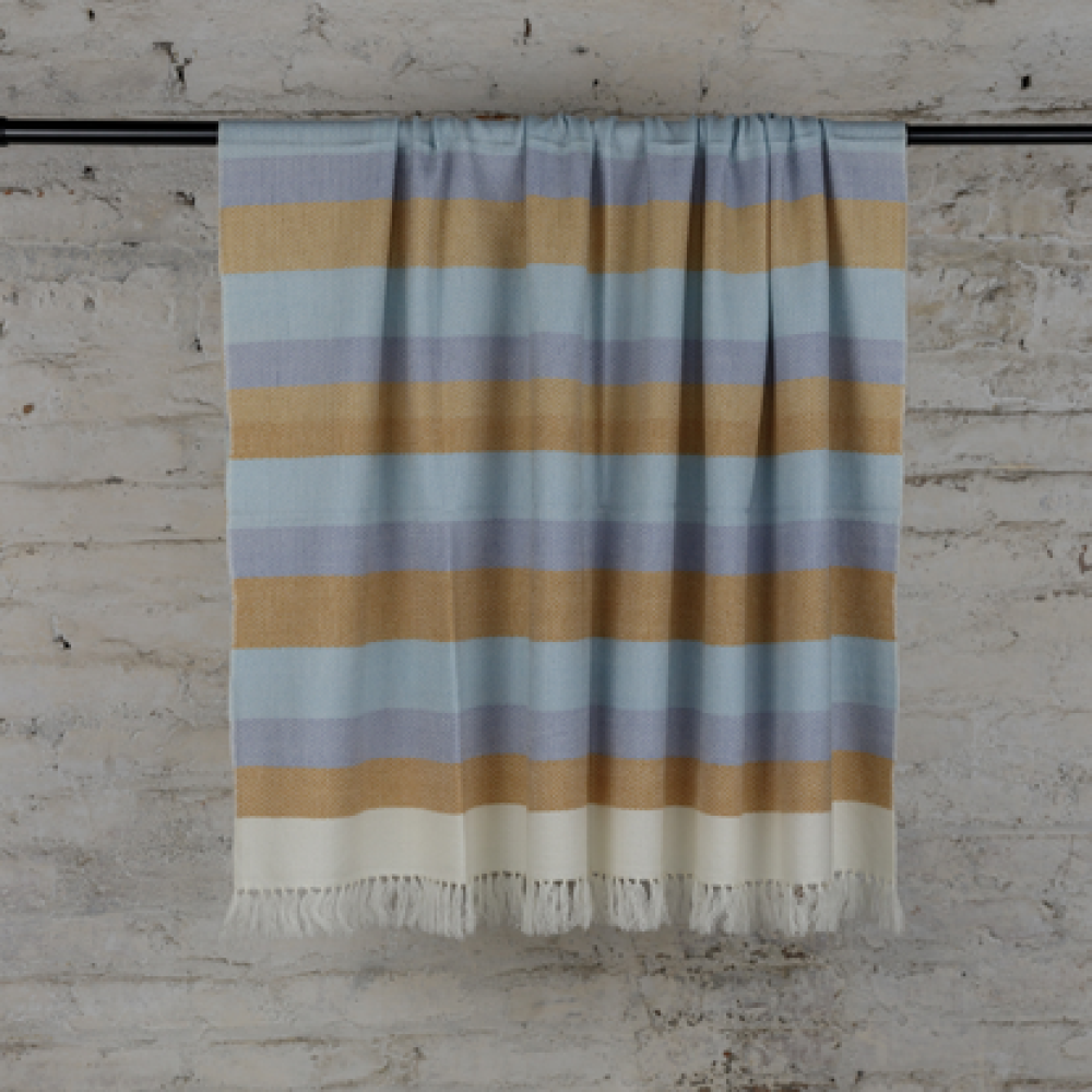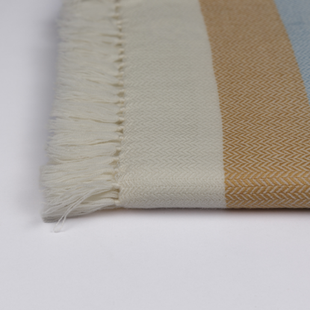 The light and inviting shades of eventide, butterscotch, egret, and baby blue bring a fresh and sophisticated energy to a room. This luxurious and understated throw emanates an inviting aura, serving as a timeless heirloom that quietly enhances both comfort and style.