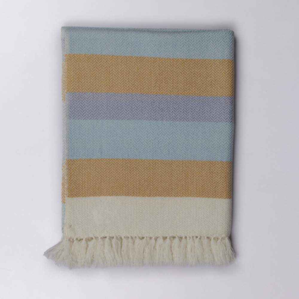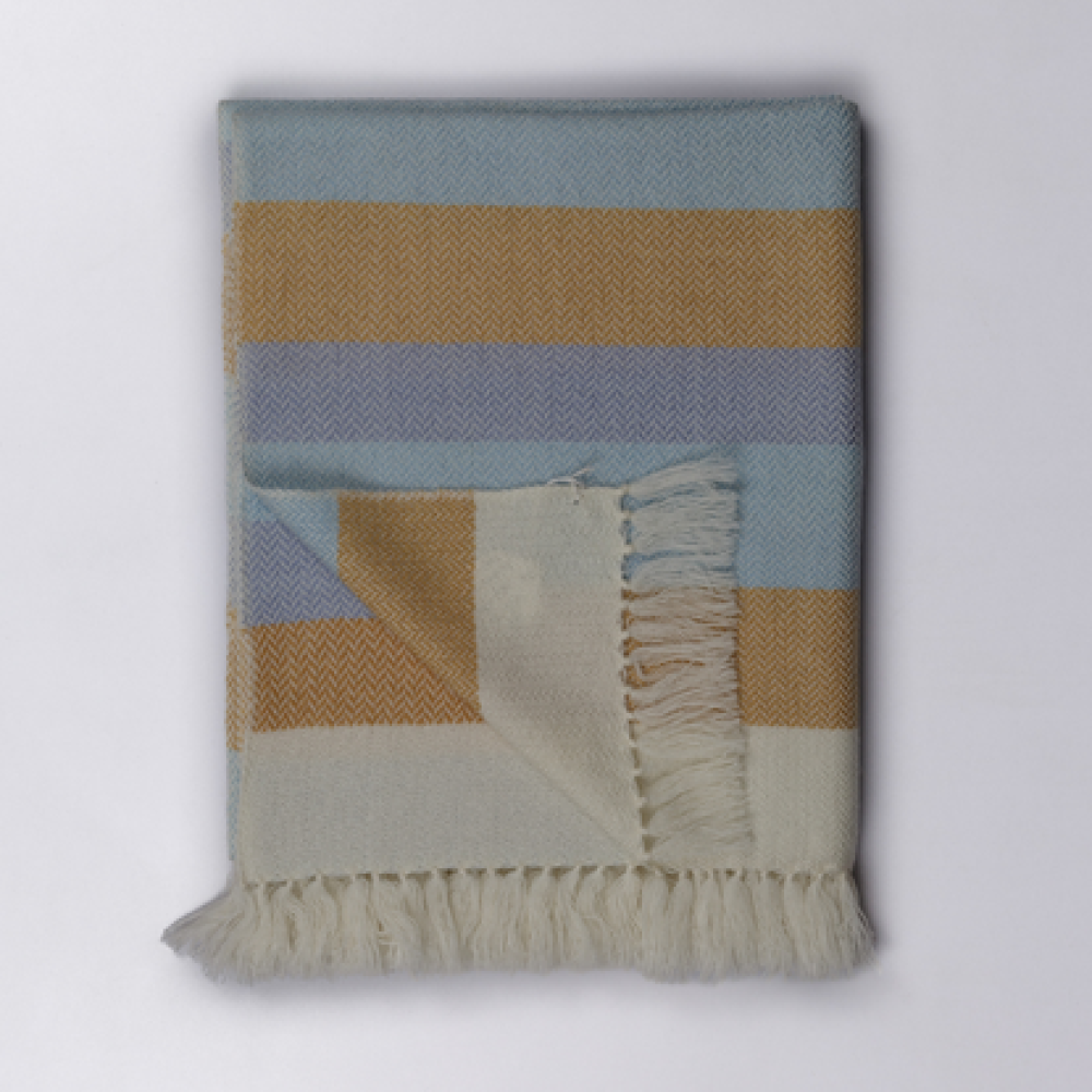 Enhance the ambience of a room with this uplifting eventide, butterscotch, egret, and baby blue throw. Handwoven by artisans using premium Himalayan wool, this piece is both hypoallergenic and sustainable. Measuring 50 x 60 inches, this piece is woven using a careful chevron technique and finished with classic single-knot tassels, offering superior breathability, structural integrity, and a plush softness that stands the test of time.