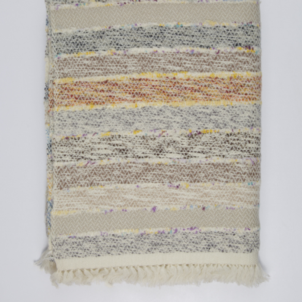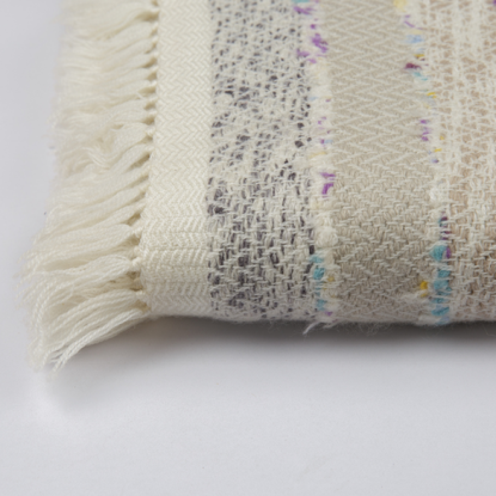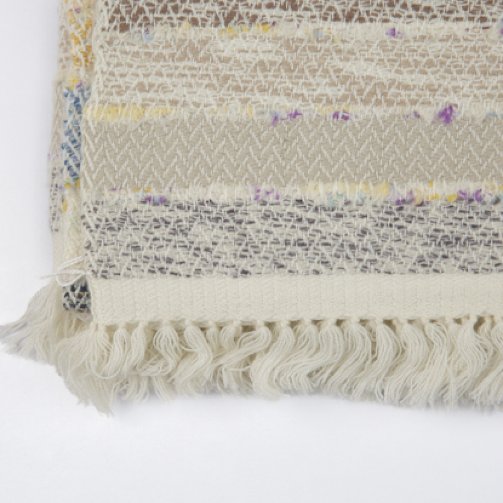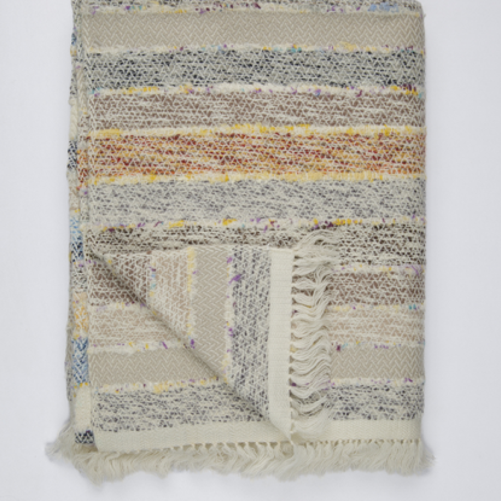 Enhance the elegance of a space with this soft striped multi color throw. Handwoven by Himalayan artisans using a bespoke blend of 60% wool and 40% cashmere, it’s a luxuriously plush, hypoallergenic, and sustainable piece. Measuring 50 x 70 inches, this piece is woven using a specialist chevron technique and finished with sophisticated single-knot tassels, providing the perfect balance between softness and structural durability.