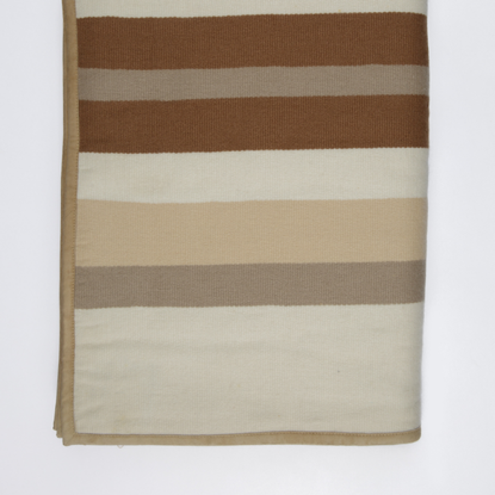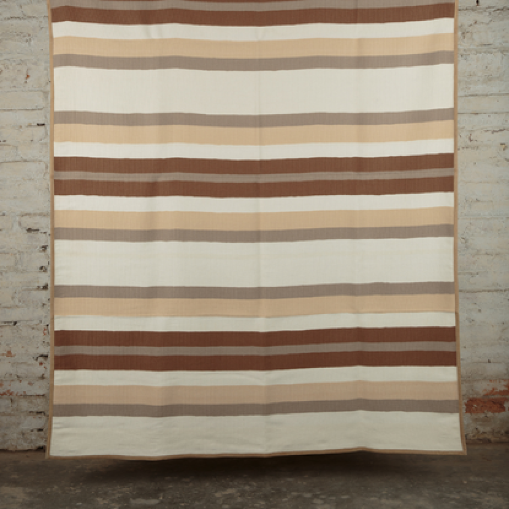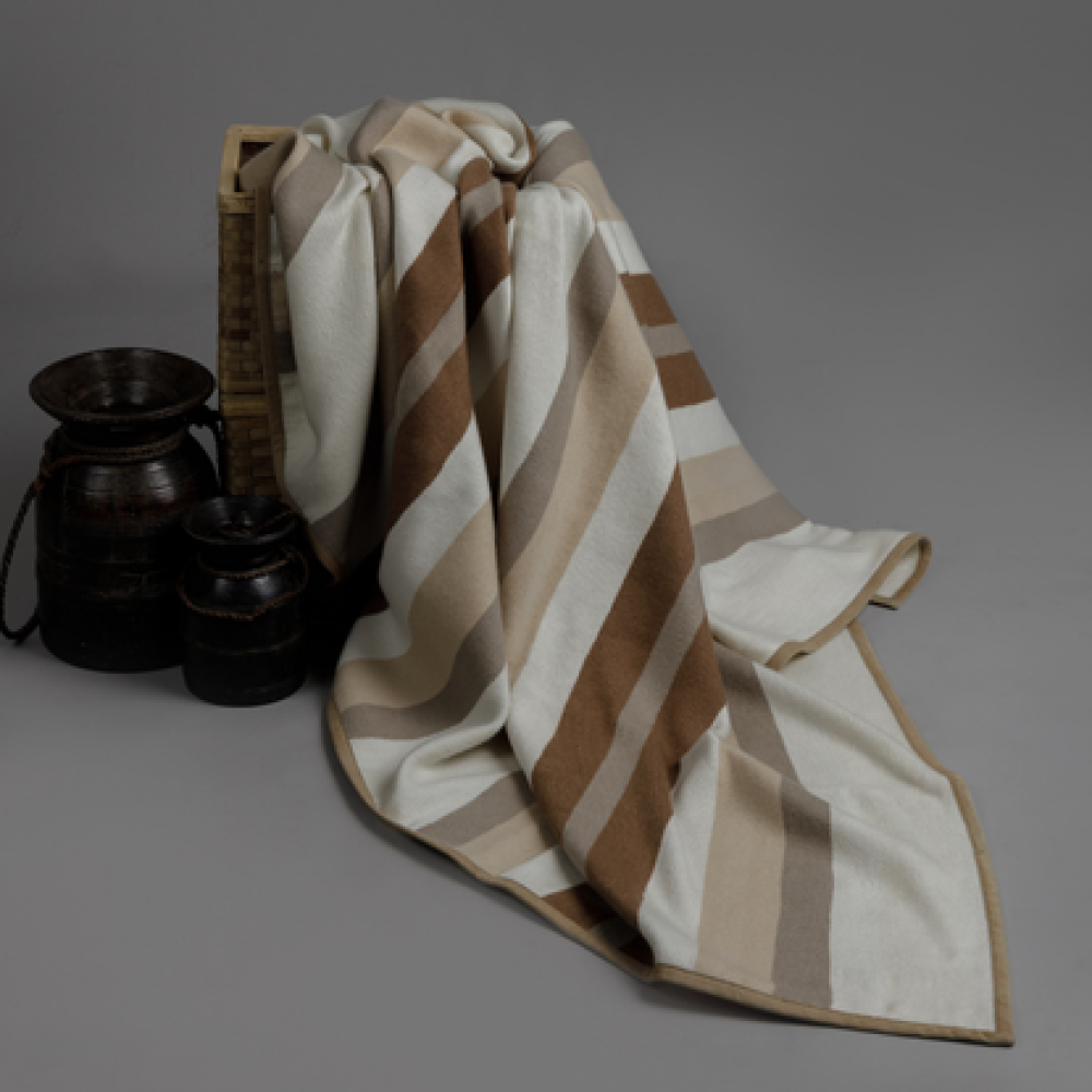 Its warm, tawny, birch, nougat, and egret-striped design adds a grounded and comfortable foundation to a room. The throw’s design, inspired by ancient Navajo weaving traditions, embodies a rich heritage and artisanal craftsmanship, making it an heirloom-quality piece.