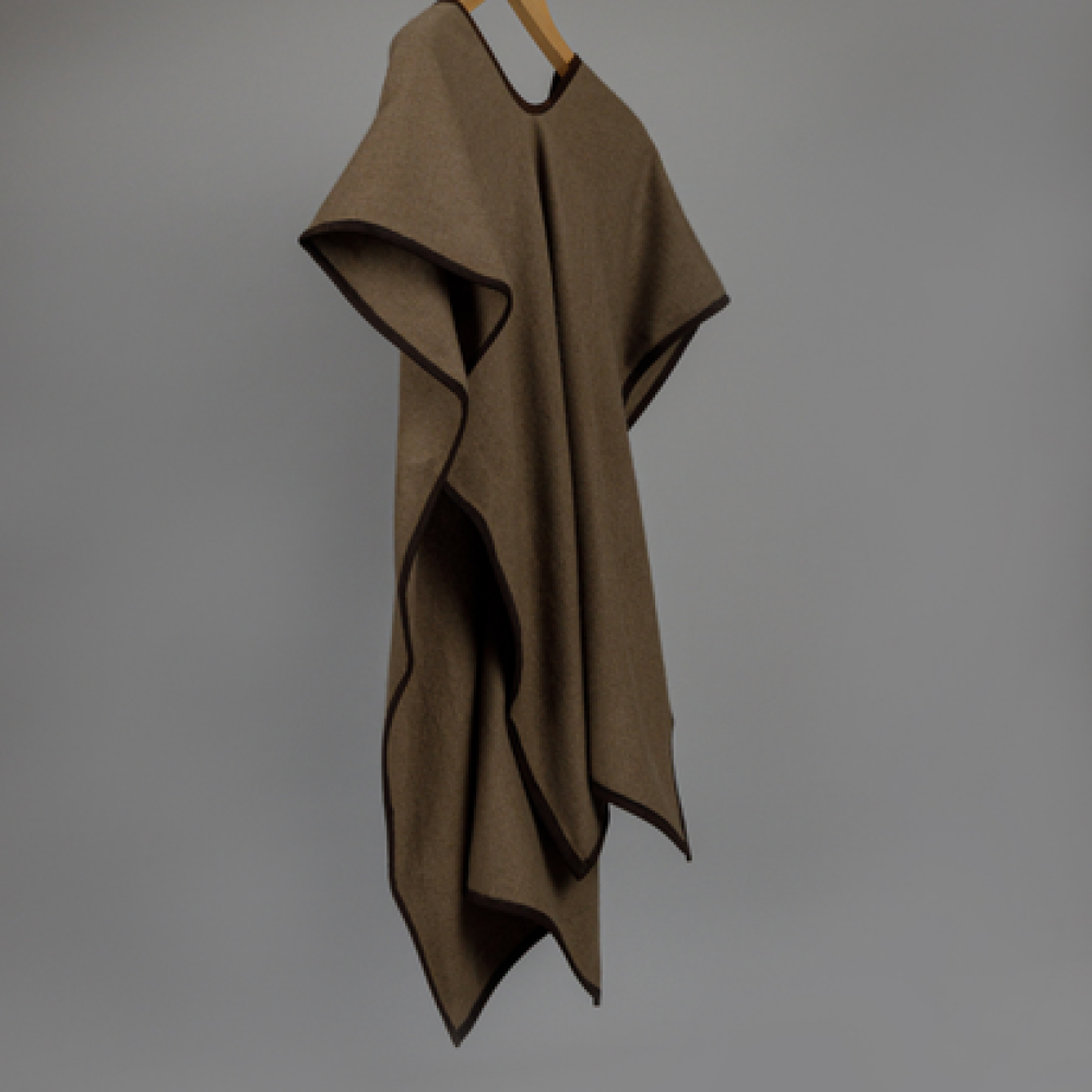 The warm, earthy natural brown tones combined with a dark suede accent create a timeless, grounded aesthetic ideal for year-round wear. The poncho's cashmere fibers are naturally hypoallergenic, ensuring supreme comfort against the skin while maintaining a plush, breathable feel.