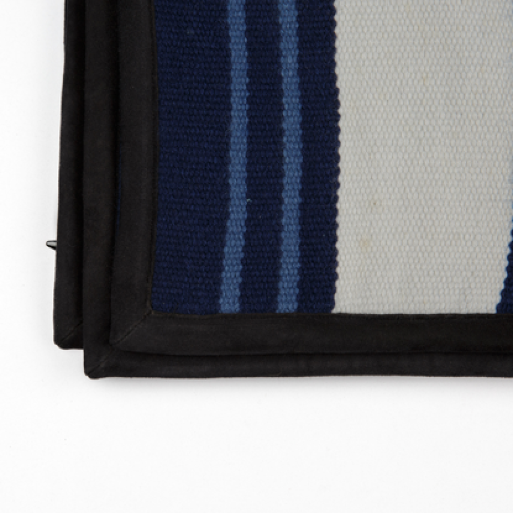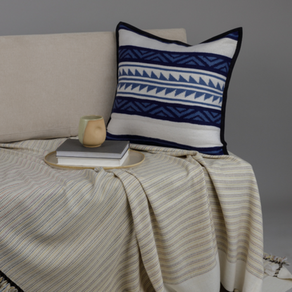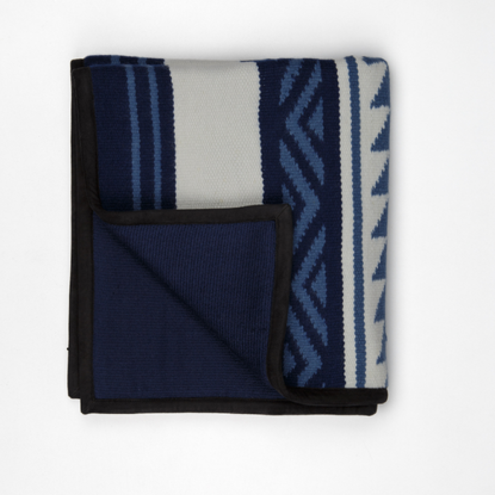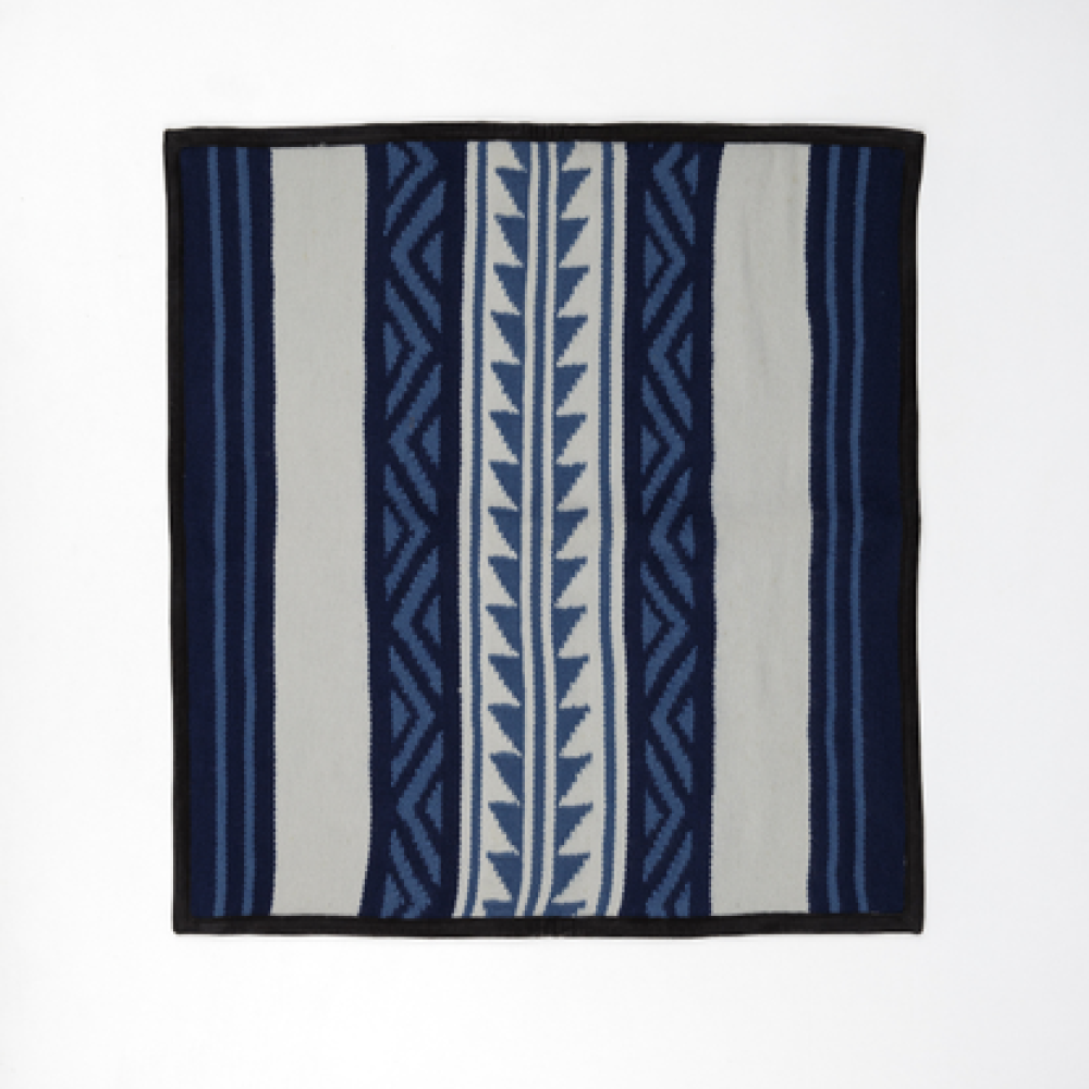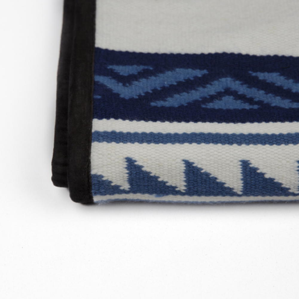 Add this iconic throw to a pillow with this beautiful blue and white Navajo-inspired piece. Handwoven using a bespoke blend of 94% cashmere and 6% silk by Himalayan artisans, this is a premium piece that seamlessly blends ancient cultural traditions and class into a fabric. Measuring 20 x 21 inches, this piece is woven using a Navajo-inspired weave and finished with suede trim, making it a striking addition that commands appreciation for its artistry.