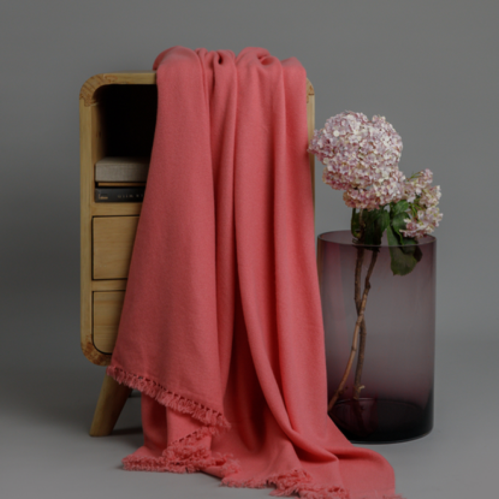 Dive into ultimate relaxation with this exquisite deep sea coral throw. Handwoven using 100% premium cashmere by Himalayan artisans, this is a vibrant piece that invites positivity and peace. Measuring 50 x 70 inches, handwoven using a weft back technique and finished with single knot tassels, the bespoke throw brings a sumptuously soft touch and subtle elegance to a room.