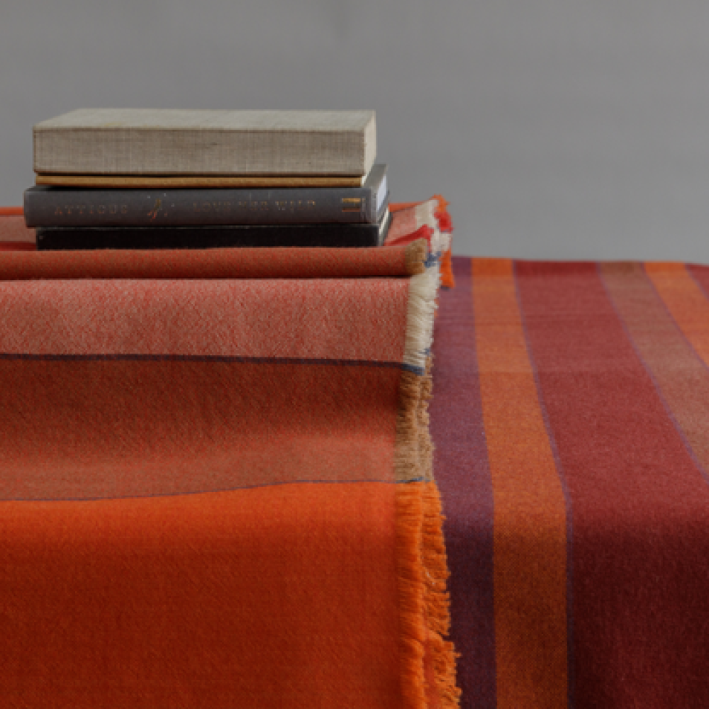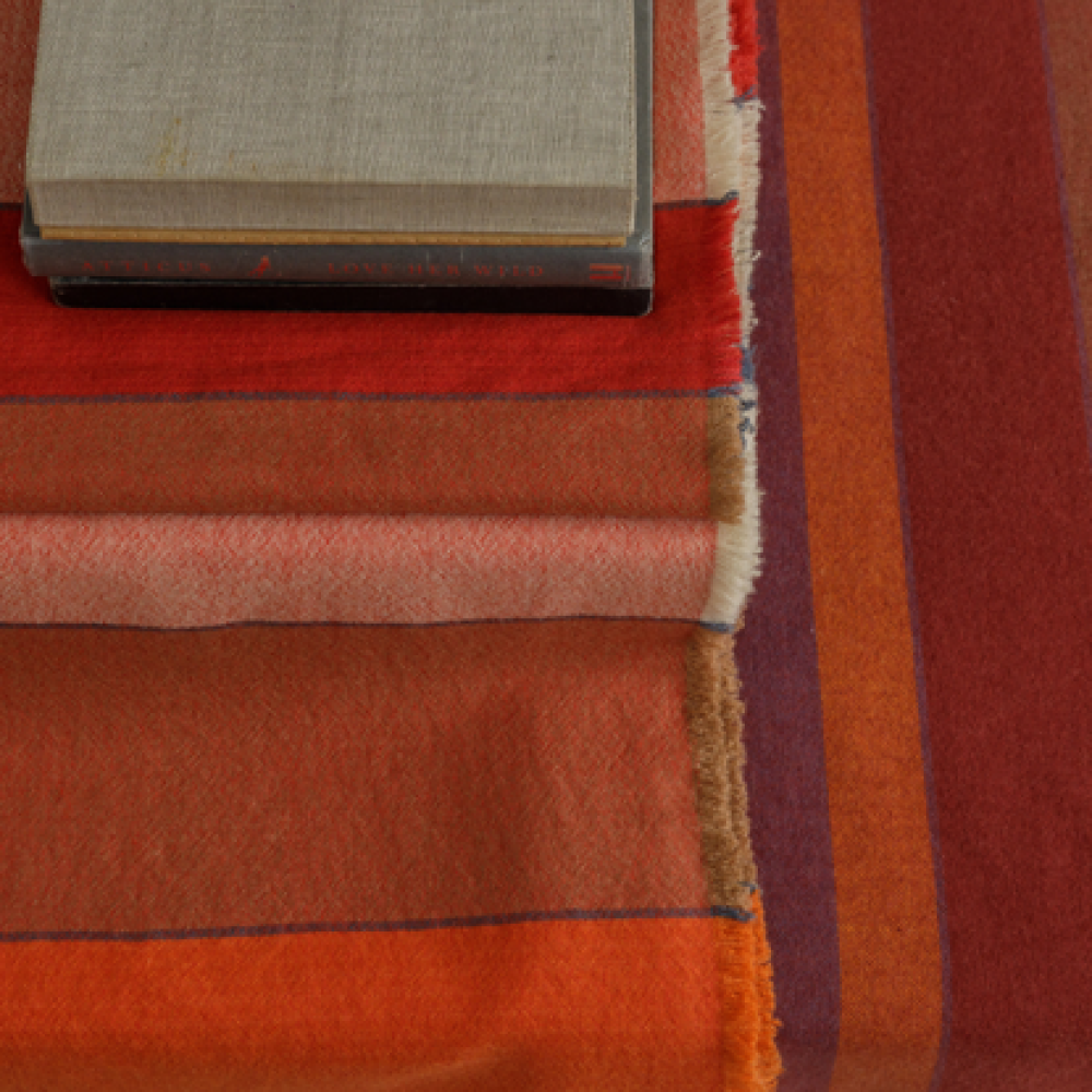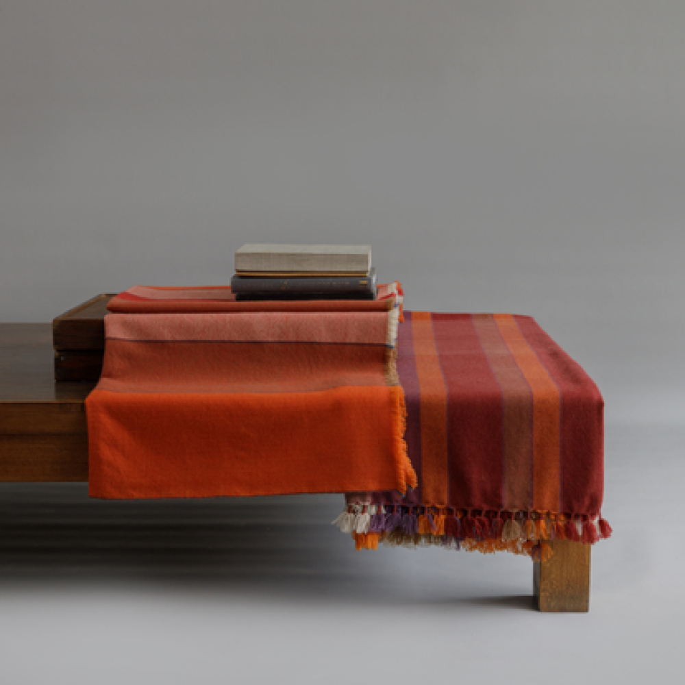 Its exotic palette of orange rust, saffron, burnt henna and grapeade stripes bring a sense of grounded sophistication to a room. The intricately blended earthy shades influenced from the Nagaland, create a rich heritage piece.