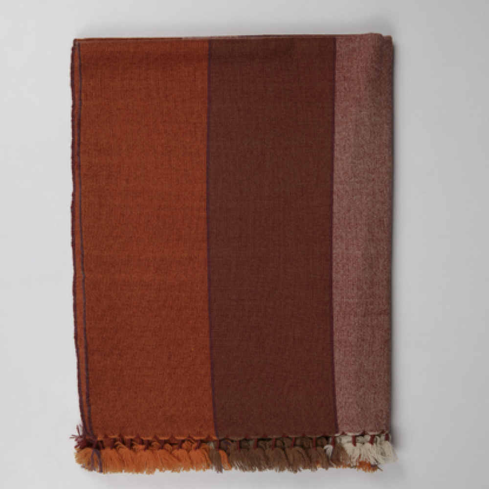 Infuse an earthy elegance to a room with this stunning striped golden poppy, vermillion, omber blue and thrush striped throw. Handwoven using 100% premium cashmere by Himalayan artisans, this is a sumptuously soft and cozy piece. Measuring 54 x 70 inches, woven using a gauze weave and finished with crew cut tassels, it offers a subtle sophistication without overpowering a room's ambience.