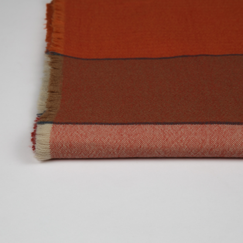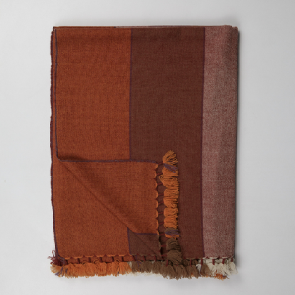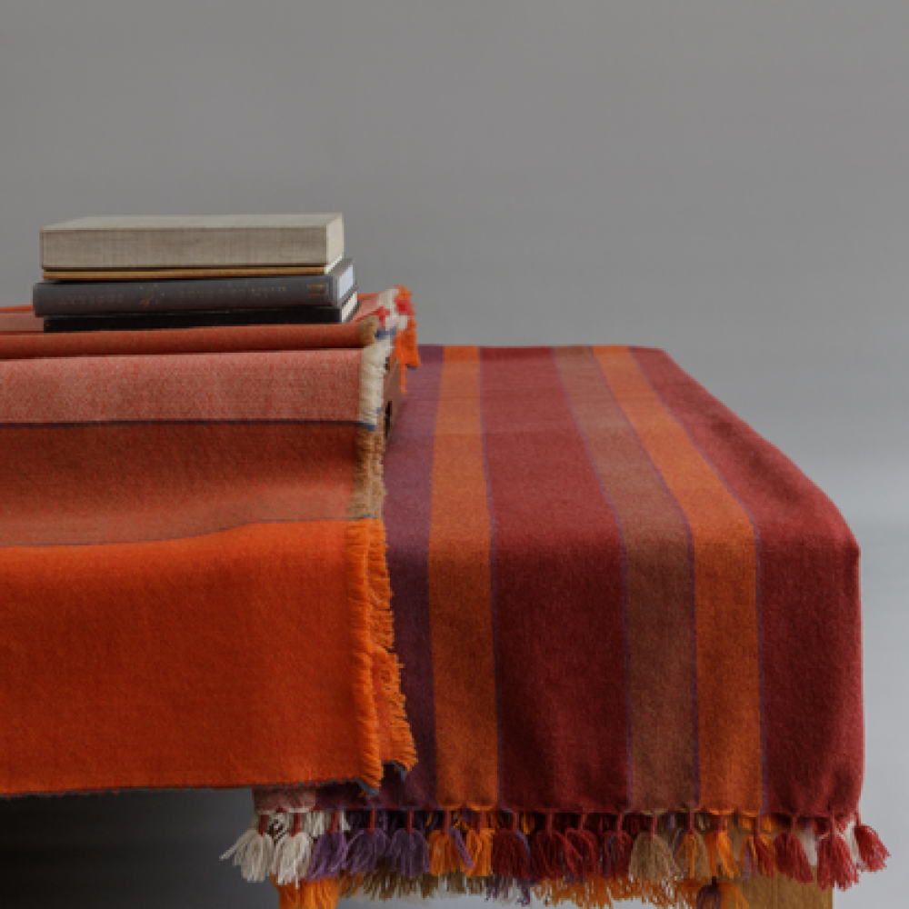 Its natural palette of golden poppy, vermillion, omber blue and thrush stripes evokes a rejuvenating feel, balancing a vibrant and calm aesthetic. This bespoke throw exemplifies timeless luxury—soft, durable, and designed to be cherished and passed down through generations.