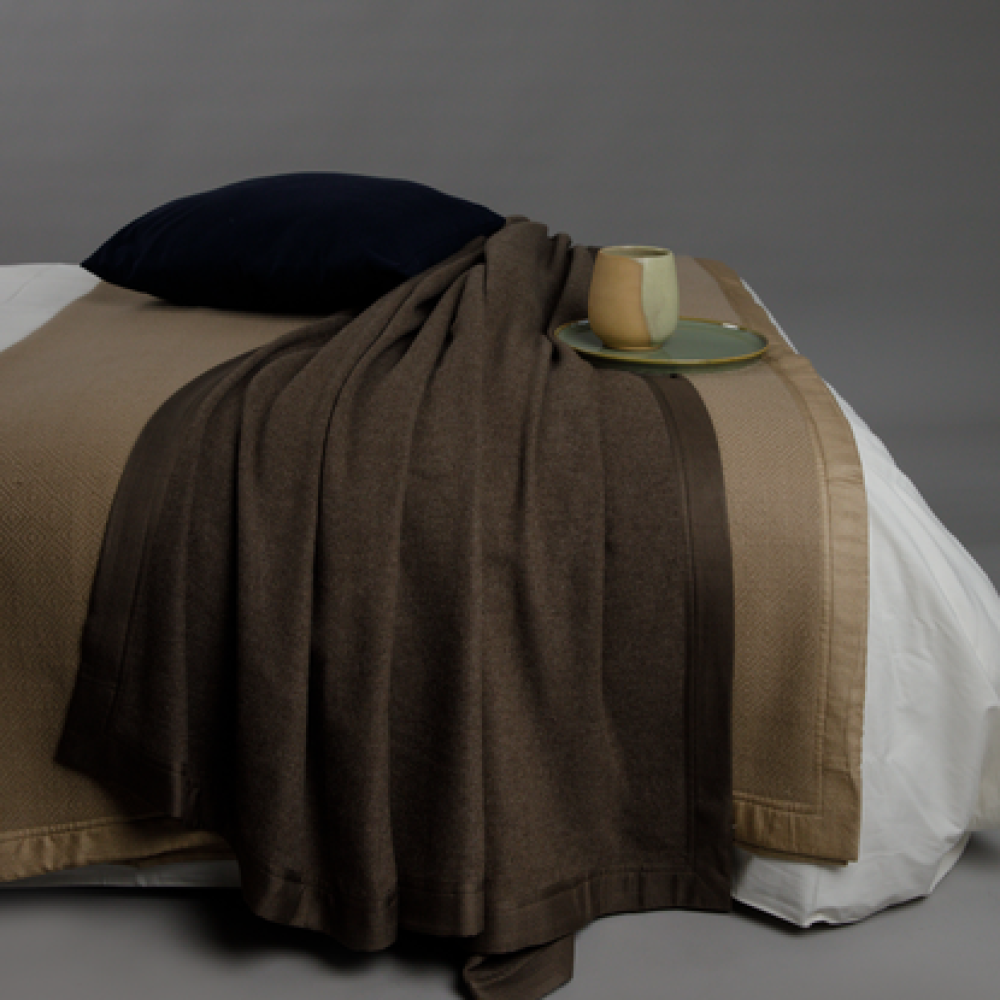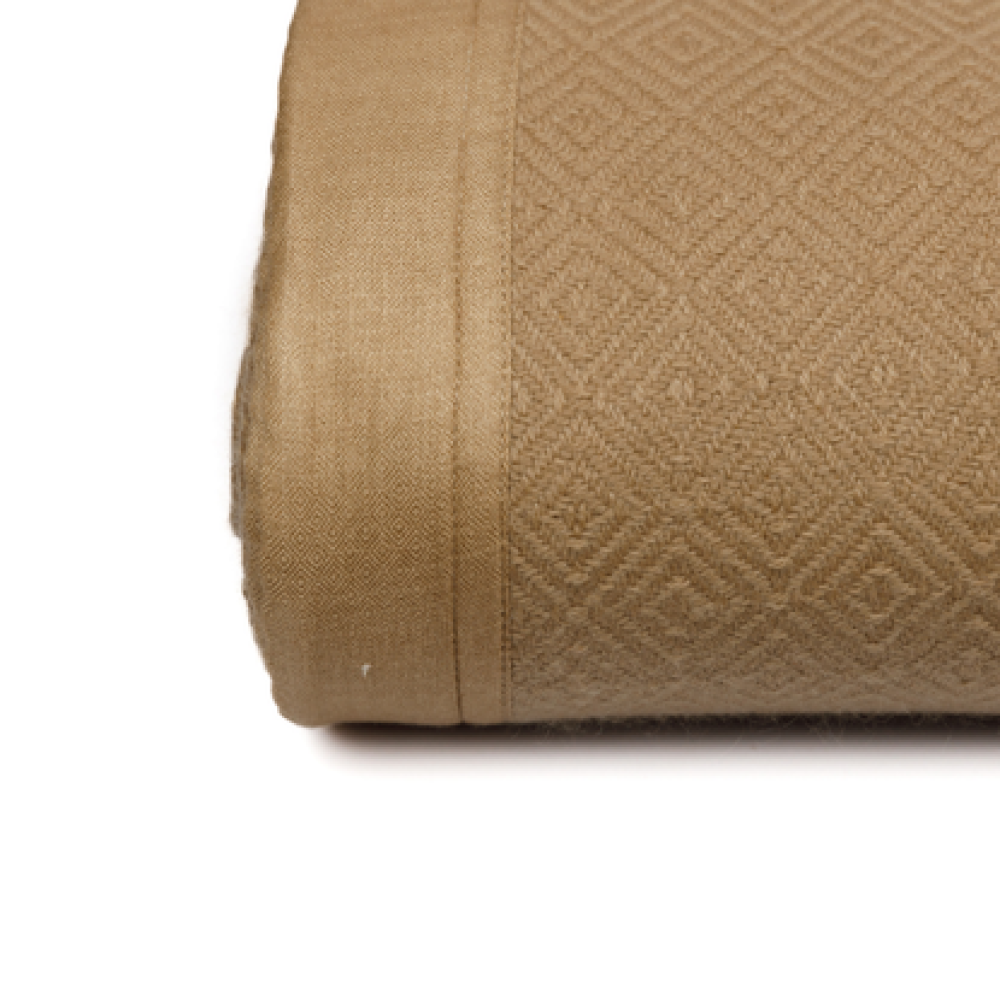 Embrace a natural and effortless aesthetic with the stylish nougat king blanket. Delicately made from the expert hands of Himalayan artisans, using 100% premium Himalayan cashmere, it’s a chic minimalistic piece that invites comfort and relaxation. Measuring 104 x 104 inches, and weft using a sophisticated diamond weave, its stunning geometric pattern enhances any bed or sofa with refined elegance.